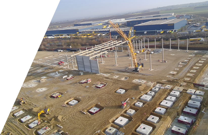 Die Erdarbeiten auf dem Baugelände sind abgeschlossen. Erste sichtbare Baufortschritte zeigen sich: Mit der Herstellung der Stützenfundamente und der Aufstellung erster Wandelemente wird der Übergang zur Hochbauphase markiert.