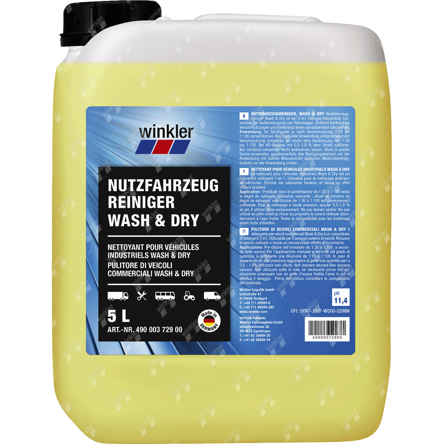 Das alkalische Reinigungsmittel wurde speziell für die Anforderungen in Speditionen, Fuhrparks, Werkstätten und Nutzfahrzeugbetrieben entwickelt. Es vereint alle Schritte der Außenreinigung in einem Produkt: