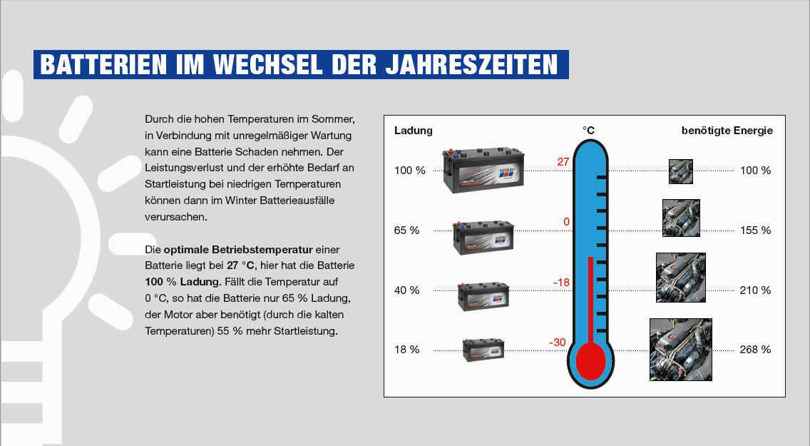 Es ist ebenfalls wichtig, die Batterien möglichst oft aufzuladen ( mind. 2 x jährlich ). Nutzfahrzeugbatterien werden öfter und intensiver entladen als Batterien in einem Pkw. Dementsprechend muss ihnen mehr Aufmerksamkeit geschenkt werden.