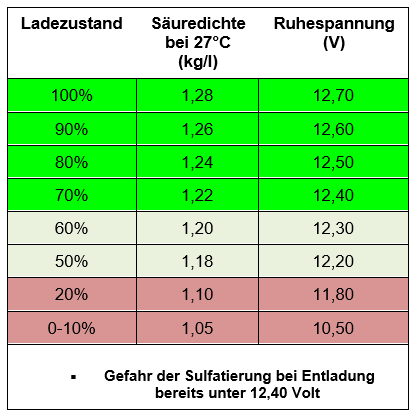 Eine vollständig geladene Batterie hat eine Spannung von 12,7 Volt, alles darüber ist Oberflächenladung. Wenn die Spannung allerdings auf 12,4 Volt oder darunterfällt, kann es zu einer Sulfatierung der Batteriesäure und so zur ernsthaften Leistungsbeeinträchtigung kommen.