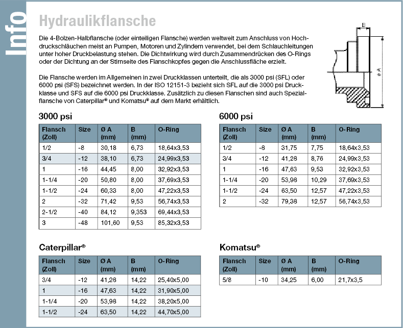 Als Erstes muss die richtige Größe des SAE-Flansches für den Hydraulikanschluss festgelegt werden. Hierzu gibt es entsprechende Tabellen, welche zur Ermittlung der passenden Größe dienen
