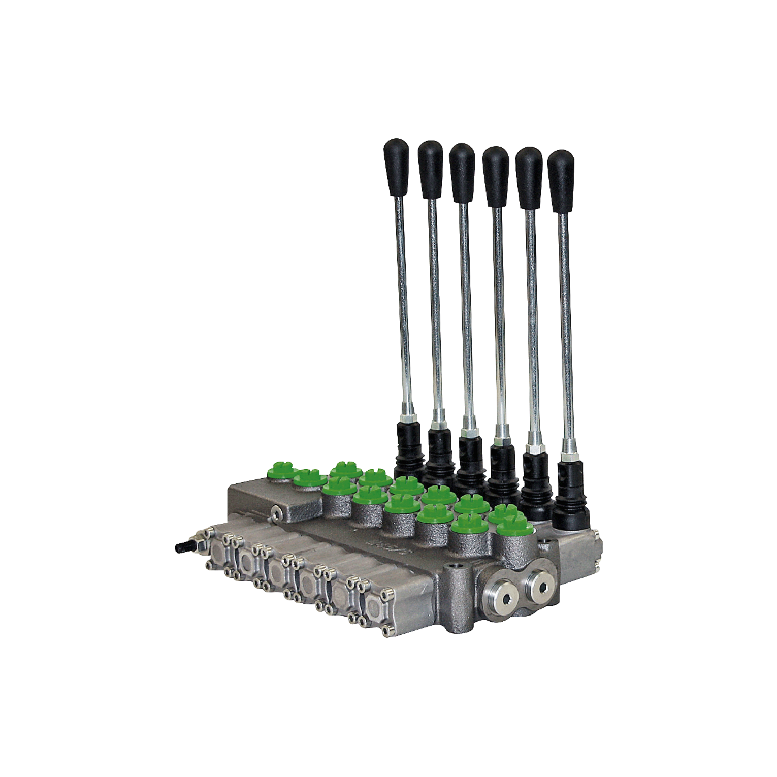 En grande partie, la commande se fait manuellement à l'aide des leviers à main. Les voies de commutation existent en version centrée sur le ressort ou à crans. Le choix de la version dépend en premier lieu de la fonction commandée. Par exemple, si un clapet de dosage est actionné à l'aide d'un cylindre de travail, les courses de commutation doivent être centrées sur le ressort. L'utilisateur peut ainsi contrôler avec précision l'angle d'ouverture de la trappe de dosage, qui s'arrête dès que le levier manuel est relâché. Si une bande transporteuse ou une brosse de balayage est commandée par la fonction, il est recommandé d'enclencher la position de commutation. Dès que l'utilisateur place le levier manuel en position de commutation, la bande transporteuse ou la brosse de balayage fonctionne en continu. Ce n'est que lorsque le levier est ramené en position zéro que la fonction s'arrête.