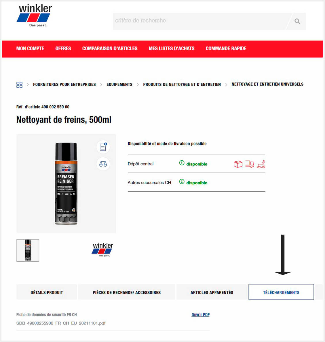 Vous recherchez une fiche de données de sécurité (FDS) ou une fiche produit pour un produit chimique ? Pour cela, il vous suffit de saisir la référence winkler correspondante dans le shop en ligne winkler et de télécharger rapidement et facilement la fiche correspondante sur la page de détail de l'article, sous l'onglet Téléchargements FDS.
