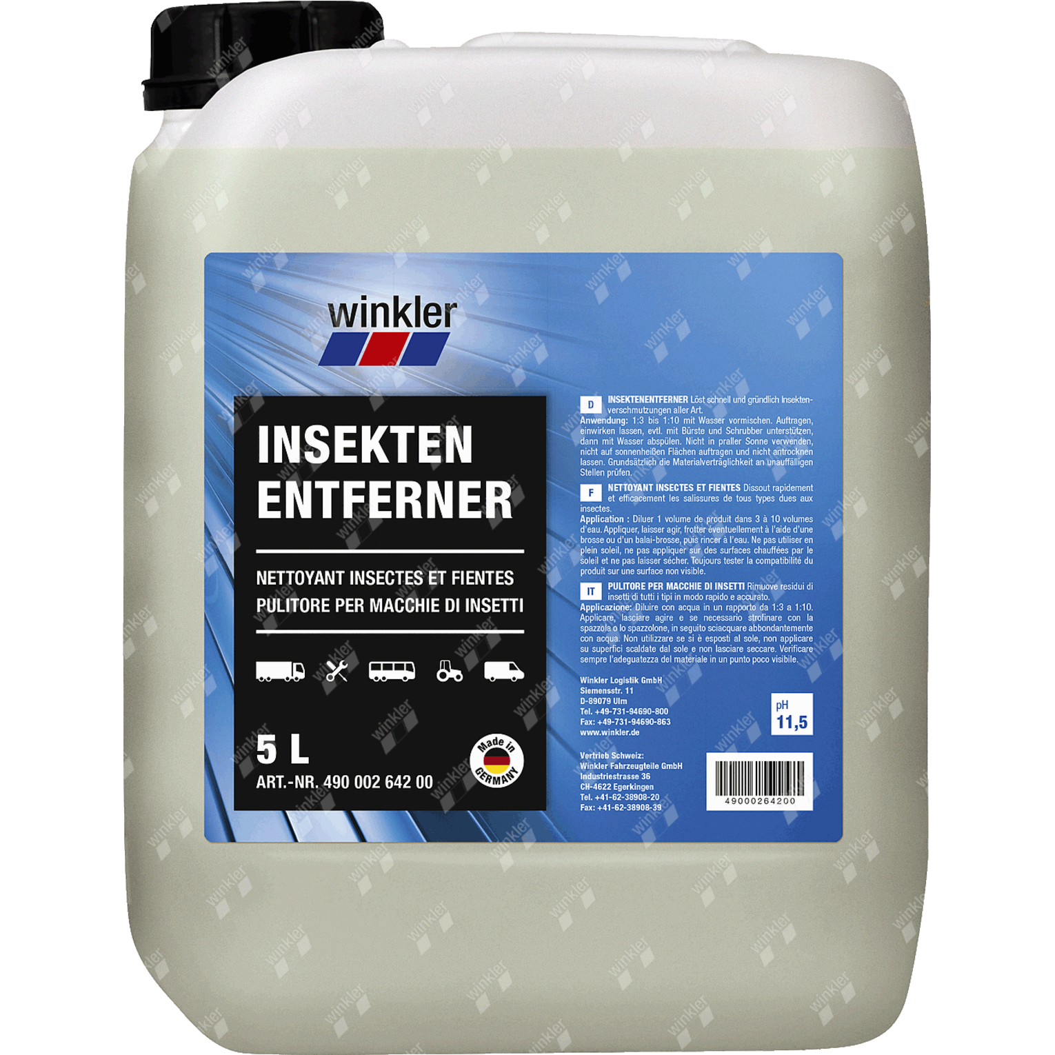 Le nettoyeur anti-insectes winkler a été spécialement conçu pour les véhicules utilitaires tels que les tracteurs, les camions et les bus. En tant que nettoyant concentré puissant, il dissout efficacement :