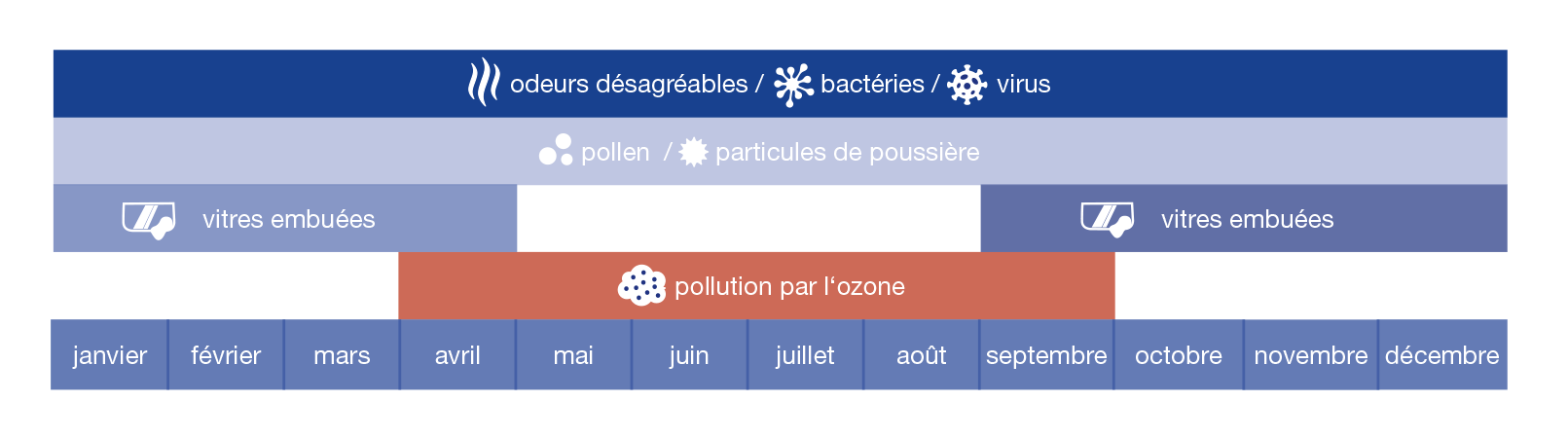 Au cours de sa durée d'utilisation, le filtre d'habitacle est chargé de pollen, de particules de poussière et de saleté. Le degré de sollicitation du filtre dépend fortement des influences extérieures. La saison, les conditions météorologiques et l'environnement ont une énorme influence à cet égard.