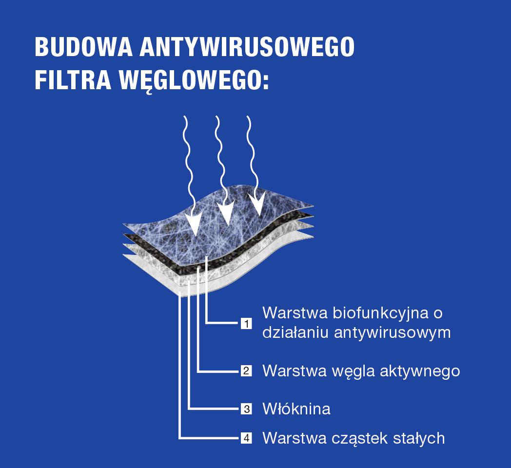 Sięgnij po nowe filtry węglowe z funkcją antywirusową. Dodatkowa warstwa funkcyjna zapewnia ochronę antywirusową na poziomie 99,97% wg ISO 18184:2019.