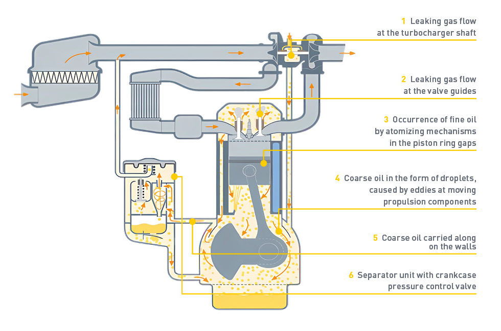 Podczas procesu spalania, sprężanie mieszanki paliwowo-tlenowej w silniku wytwarza tak zwane gazy przedmuchowe. Są one zanieczyszczone kroplami oleju, parą wodną, sadzą i pozostałościami paliwa. System wentylacji skrzyni korbowej odprowadza zanieczyszczone gazy ze skrzyni korbowej, zapobiega wzrostowi ciśnienia w silniku i doprowadza gazy do podzespołów po stronie silnika, gdzie są one oczyszczane przez separator. Po oczyszczeniu gazy są kierowane z powrotem do silnika.