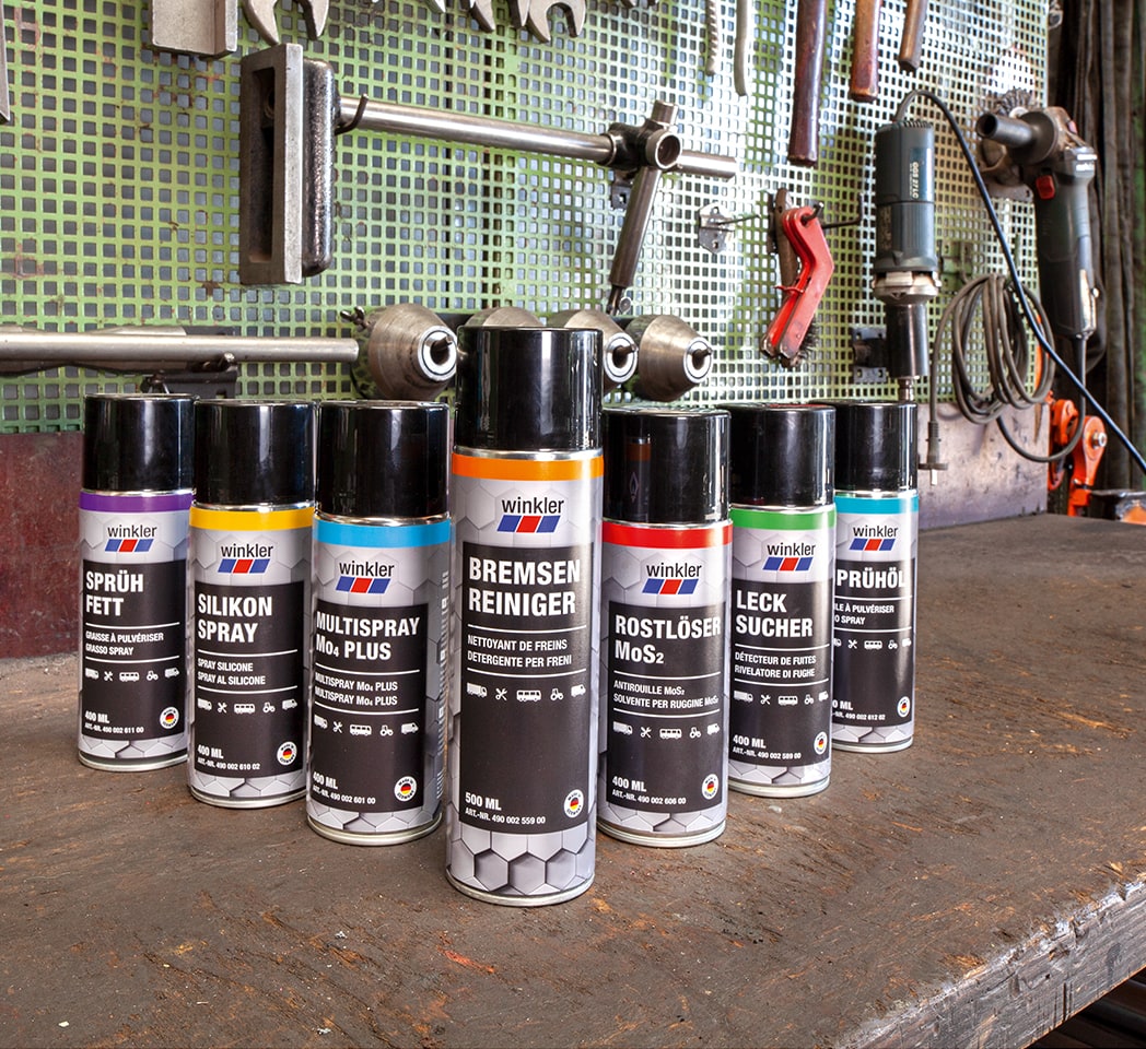 Was gesprüht werden kann, das haben wir auch: An professionellen Sprays herrscht bei uns kein Mangel. Das Sortiment von winkler umfasst Bremsenreiniger, Haftschmierspray, Kettenspray und Kupferspray ebenso wie Multifunktionsöle, Rostlöserspray, Kriechöle, Sprühfette, Silikonspray und Starthilfespray.